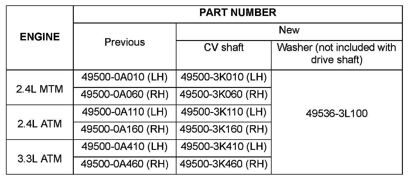 When ordering the new CV shaft part number, it is also required to order a washer. See parts table.