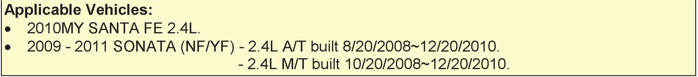 ^ This bulletin provides the repair procedure for replacing the starter motor lever in some 2009~2011MY 2.4L Sonatas, and 2010MY 2.4L Santa Fe.