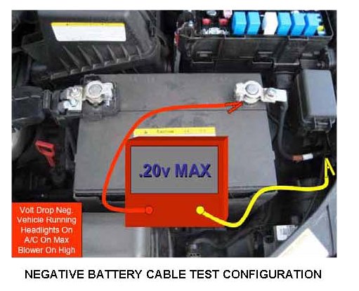 3. Perform voltage drop test on the negative battery cable. If the voltage drop is more than 0.2 volts, repair or replace the negative battery cable.