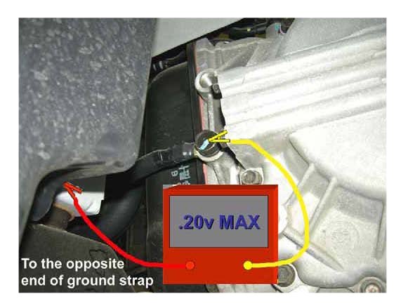5. Perform voltage drop check to all Engine and Transmission ground straps. Check with the voltmeter positive lead on one end of the strap and the negative lead to the opposite end. If the voltage drop is more than 0.2 volts, repair or replace the ground terminal and/or ground strap.