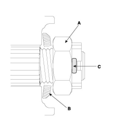 8. After installing the washer(B) with convex surface outward, install the lock nut(A) and the spilt pin(C)