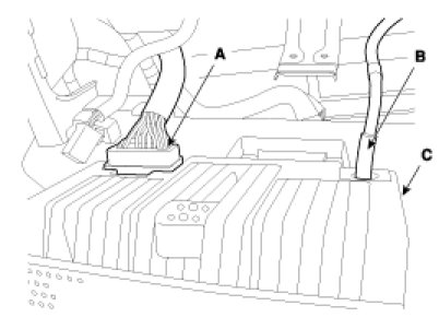 4. Disconnect the audio connector (A) and antenna cable (B), then remove the audio assembly (C).