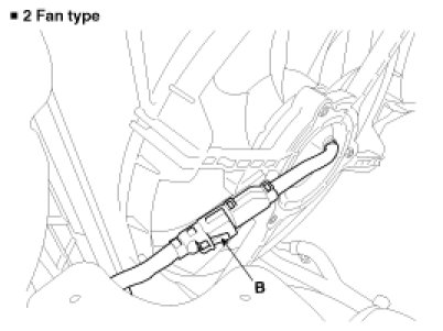 Check that the radiator fan rotates when battery voltage is applied between (+) and (-) terminals.