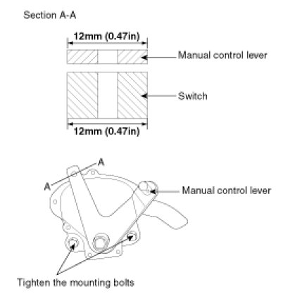 4. Loosen the transaxle range switch body mounting bolts and then turn the transaxle range switch body so the hole in the end of the manual control lever and the hole (cross section A-A in the figure) in the flange of the transaxle range switch body flange are aligned.