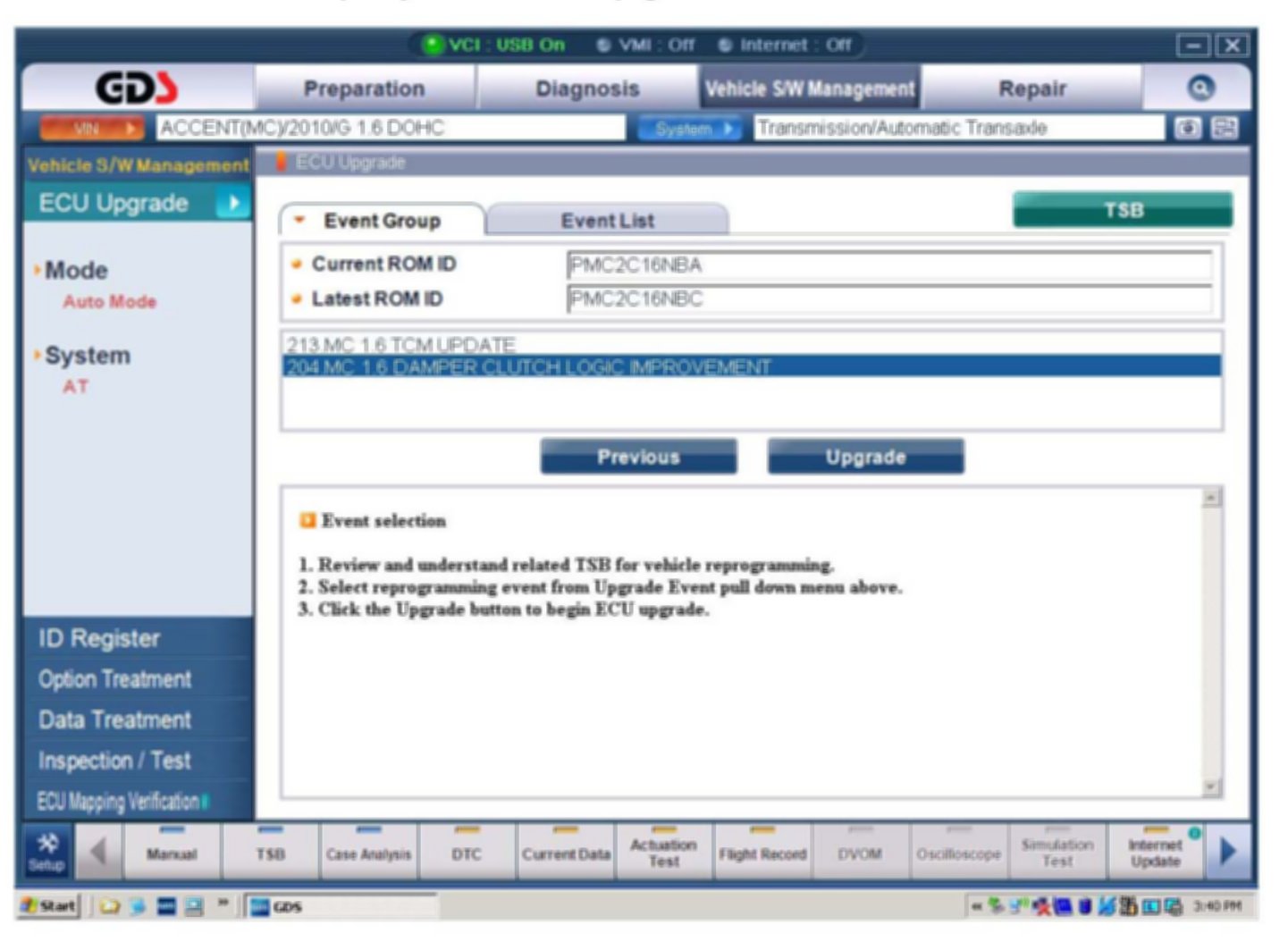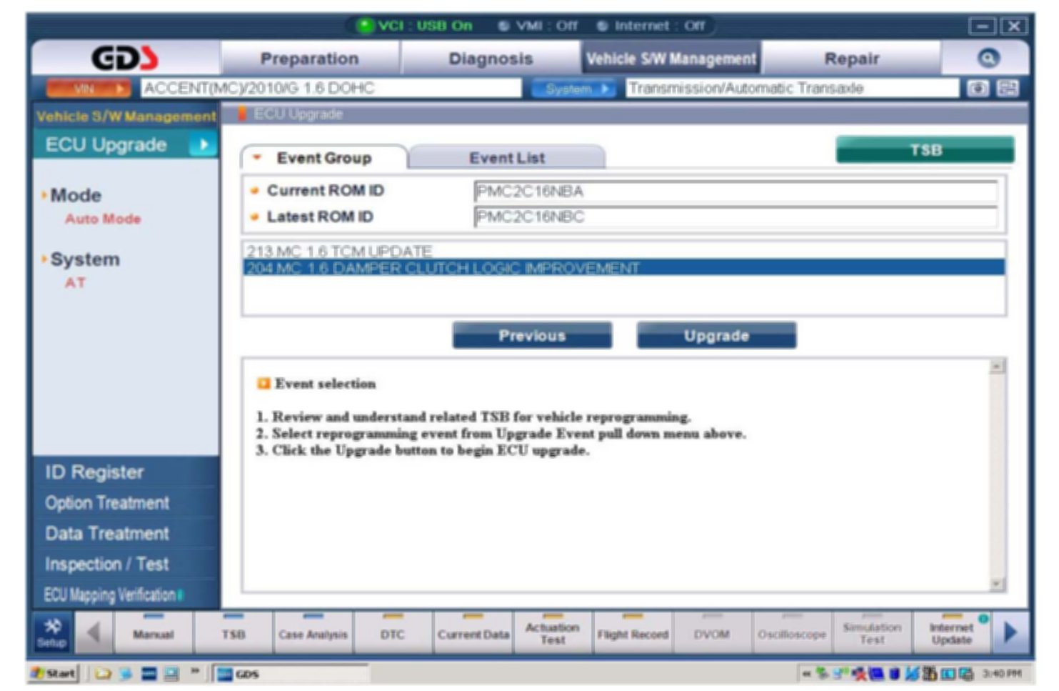 5. Update event 204 MC 1.6 Damper Clutch Logic Improvement is displayed. Confirm the ROM is applicable. Select Upgrade.