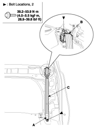 4. After loosening the retractor (B) mounting bolt, remove the rear seat belt (C).