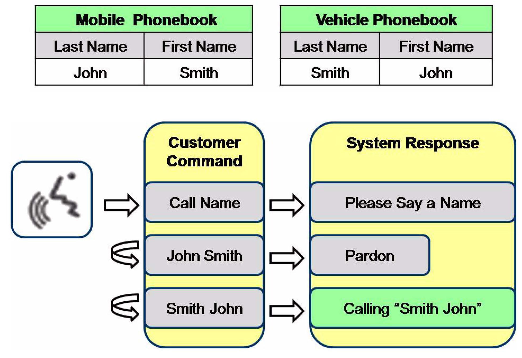 This condition can cause Voice Command complaints. If the phonebook names are interchanged, say LAST NAME first and follow by FIRST NAME when making phone calls via the Voice Command system. See the following example: