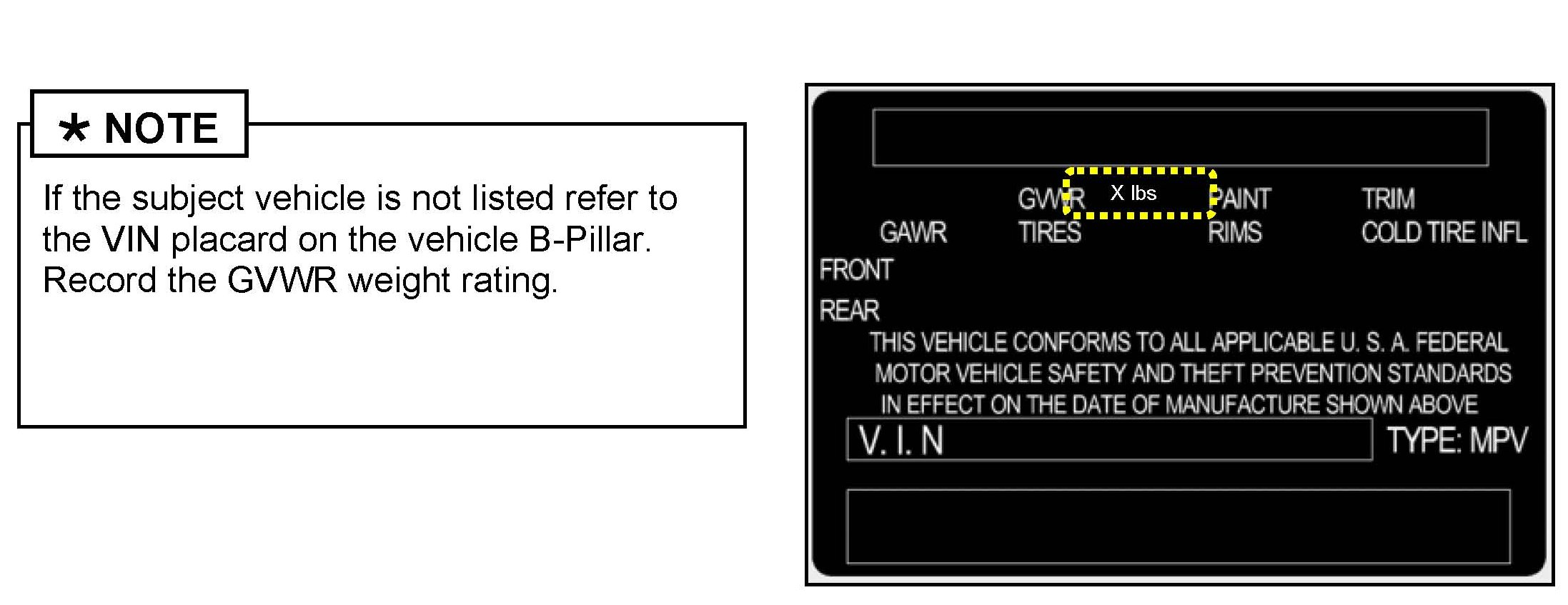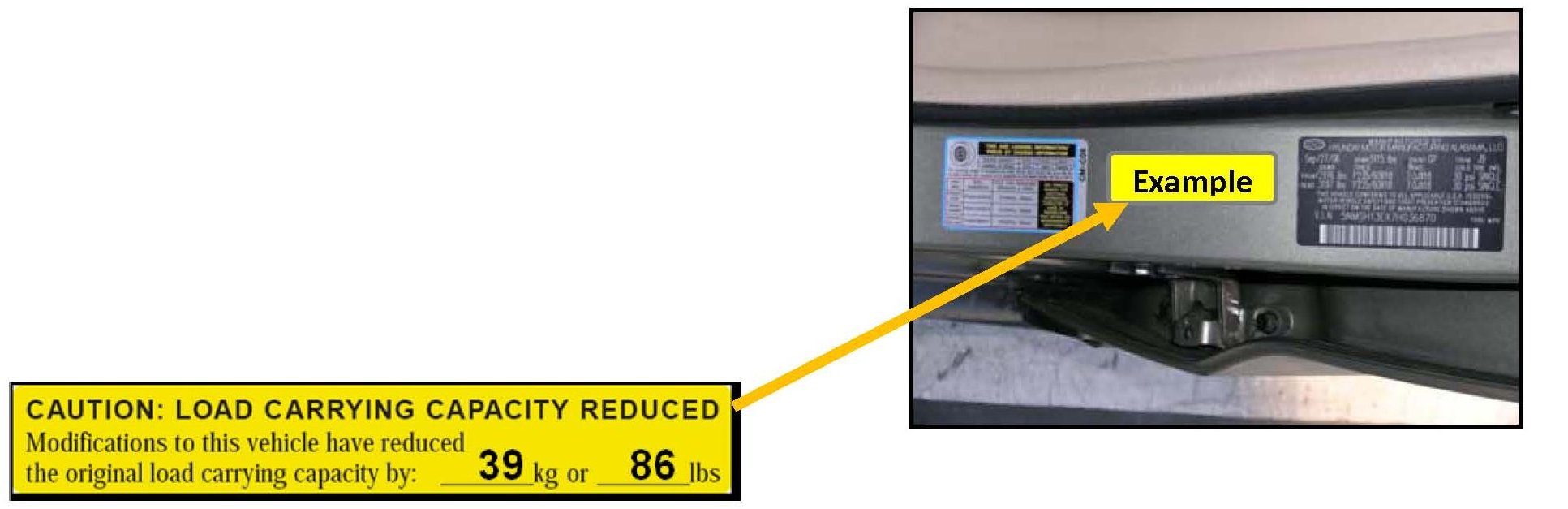 Effective June 2, 2008, Federal Motor Vehicle Safety Standard 110 (FMVSS 110) set a threshold for correcting load capacity information indicated on tire placards when vehicle weight has been increased before retail sale. This limit is the lesser of 1.5% of the Gross Vehicle Weight Rating or 45.4kg (100 pounds). If the total added weight exceeds the lesser of the limit, a label (See Figure 1) must be added to the driver-side B-pillar within 25mm (1 inch) of the original tire placard.
