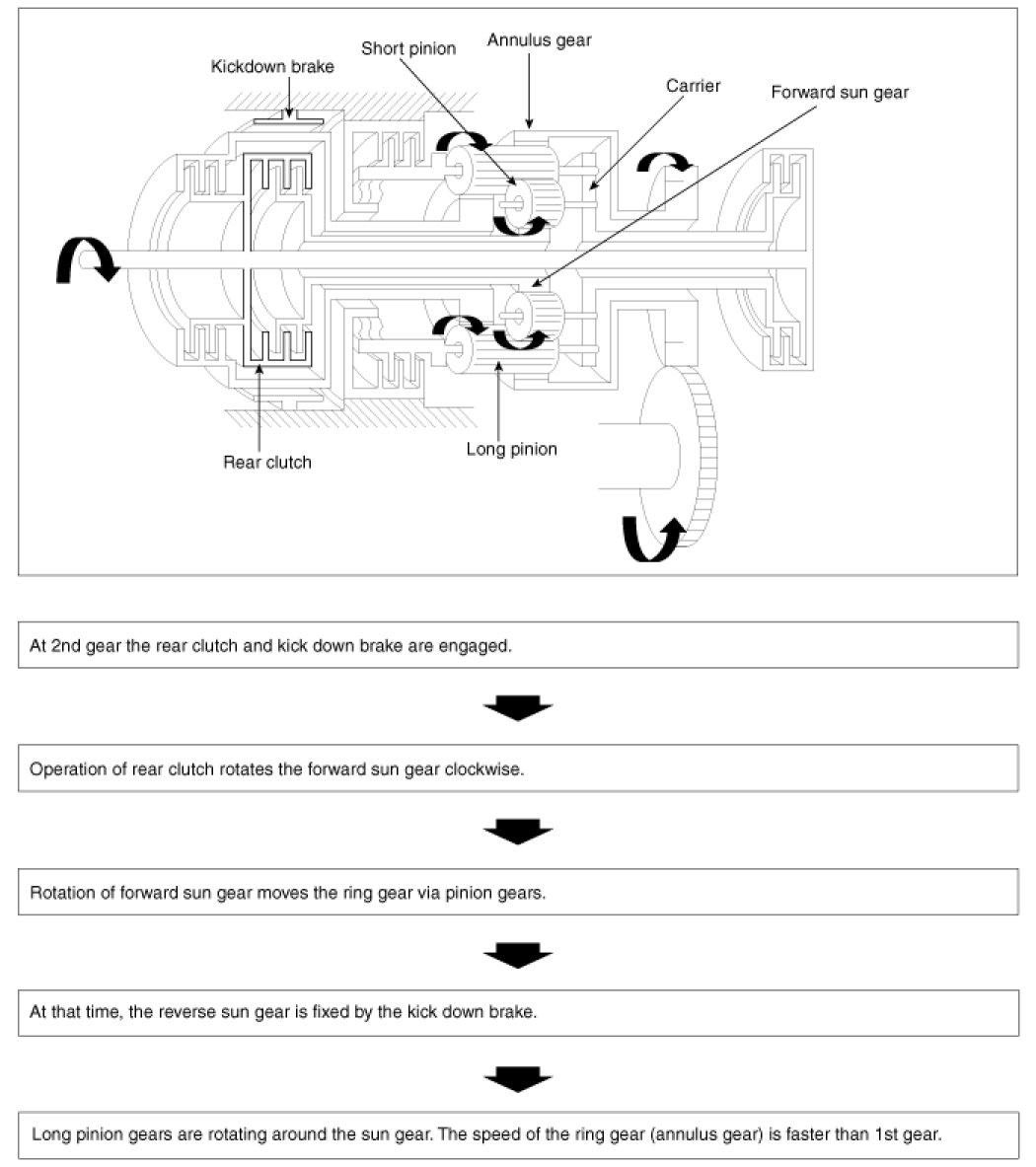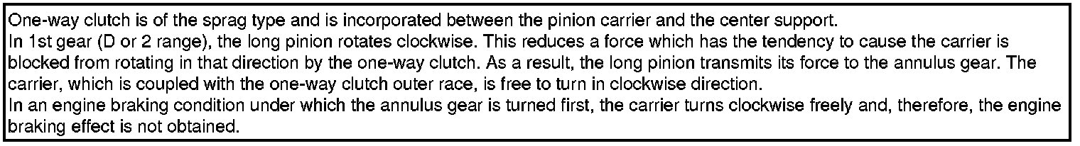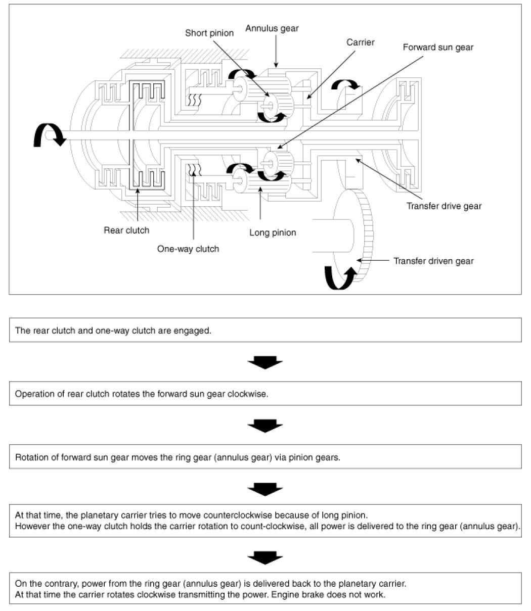 The other set, the long pinions, meshes with both the forward sun gear and with the annulus gear. The two sets of pinions also mesh with each other in pairs. The pinion carrier is built as a unit with the low reverse brake hub and the outer race of the one-way clutch. Power input is to either of the two sun gears.