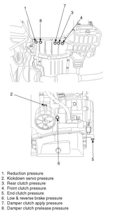 4. Connect the oil pressure gauge(09452-21500) and the oil pressure gauge adapter(09452-21002, 09452-21001) to each pressure discharge port. But use the gauge(30kg/cm2) when measuring the reverse pressure, front clutch pressure and low&reverse brake pressure.