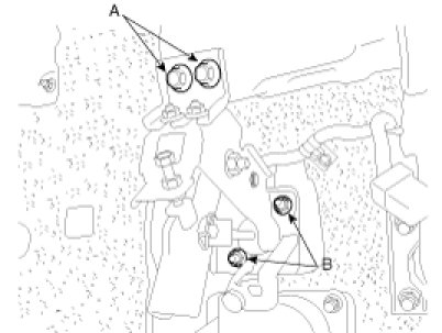 2. Remove the clutch pedal mounting bolts(A) and nuts(B).