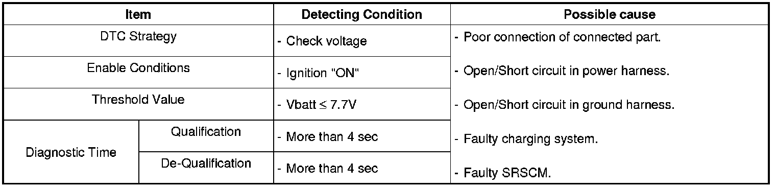 SRSCM (Supplemental Restraints System Control Module) checks input voltage when "IG ON" to make air bag system work properly.