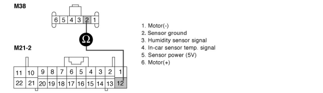 3. Measure resistance between terminal "2" of incar temp.sensor and terminal "B12" of A/C Control Unit.