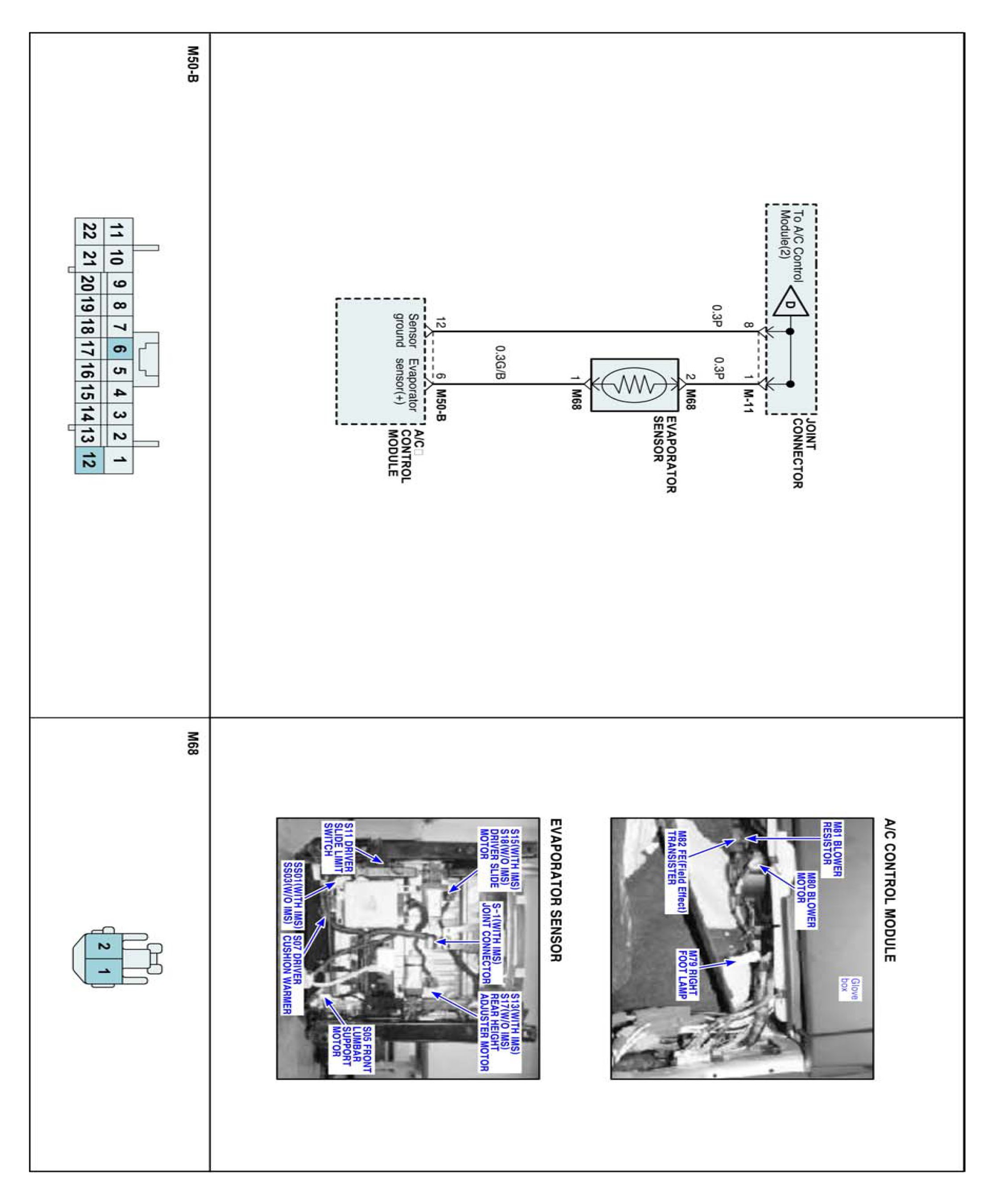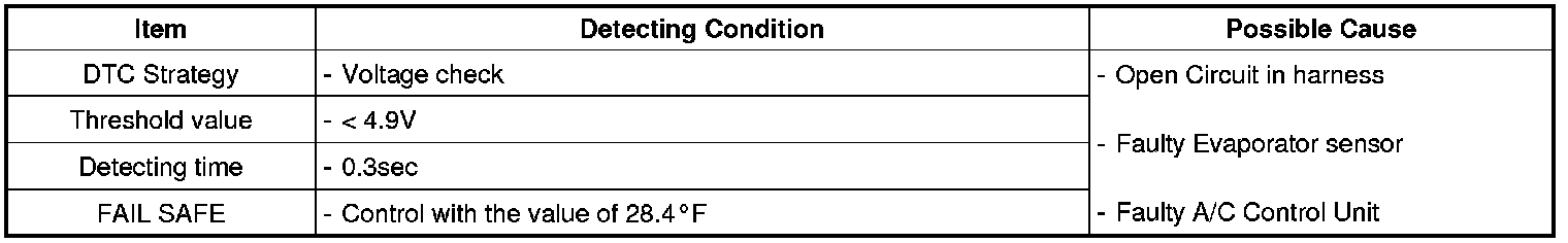 The Evaporator sensor located on heater unit detects the core temperature. It is a negative type thermistor whose resistance is inversely proportional to temperature. Evaporator sensor transforms measured temperature into voltage value and delivers it to A/C ECU. when core temperature is blow threshold value, A/C ECU interrupts compressor relay power, in order to prevent evaporator freezing by excessive cooling.
