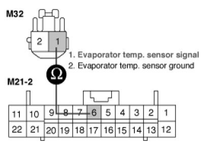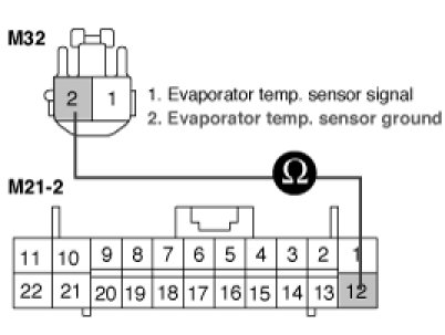 3. Measure resistance between terminal "2" of evaporator sensor and terminal "B12" of A/C Control Unit.