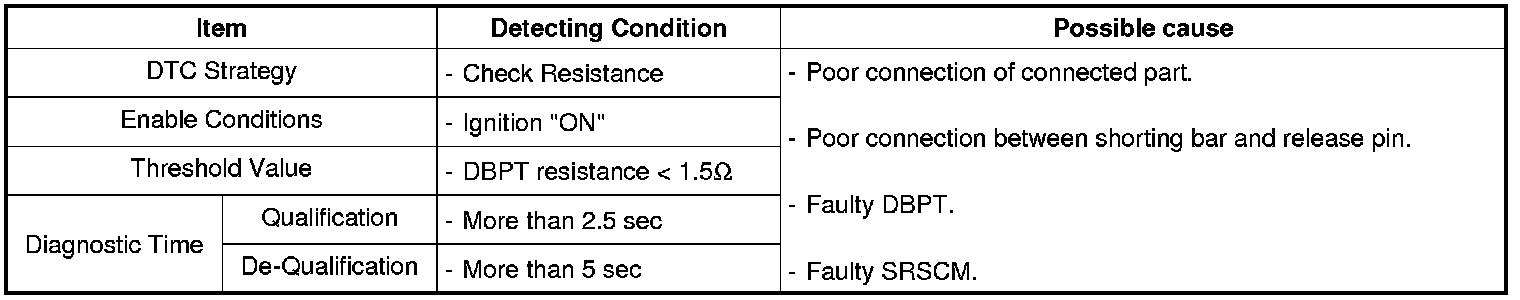 The SRSCM sets DTC B1362 if the measured resistance value of DBPT circuit is less than the threshold value.