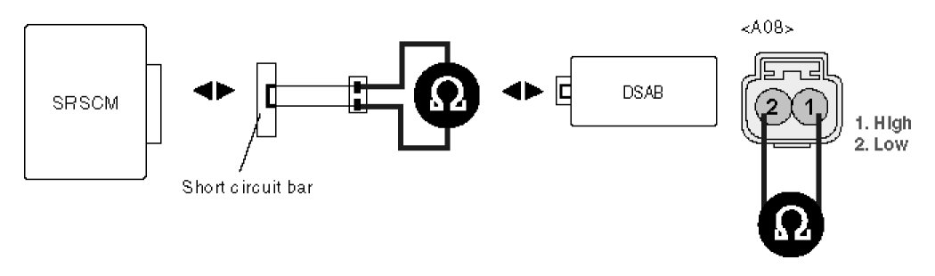 4. Measure resistance between terminal "2" and "1" of the DSAB harness connector.