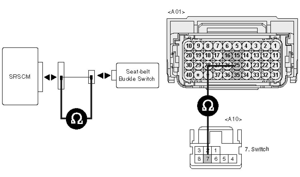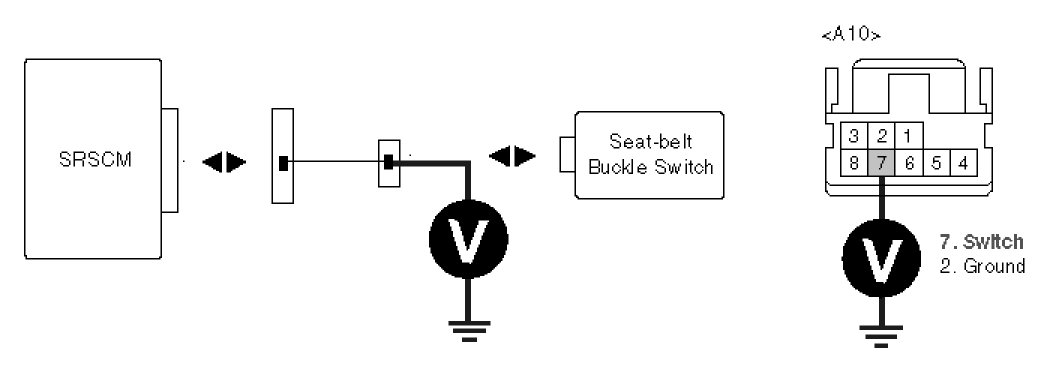 5. Measure voltage between terminal "2" or "7" of the Seat-belt Buckle Switch harness connector and chassis ground.