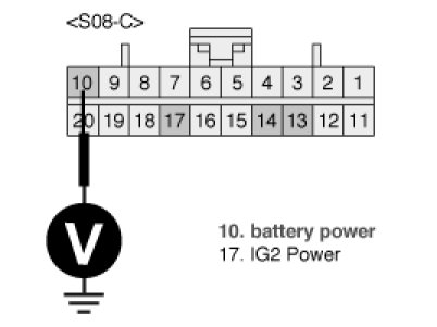 3. Measure voltage value between terminal "17" of Powerseat ECU and chassis ground.