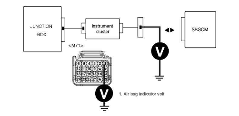 5. Measure voltage between terminal "1" of the SRSCM main harness connector and chassis ground.