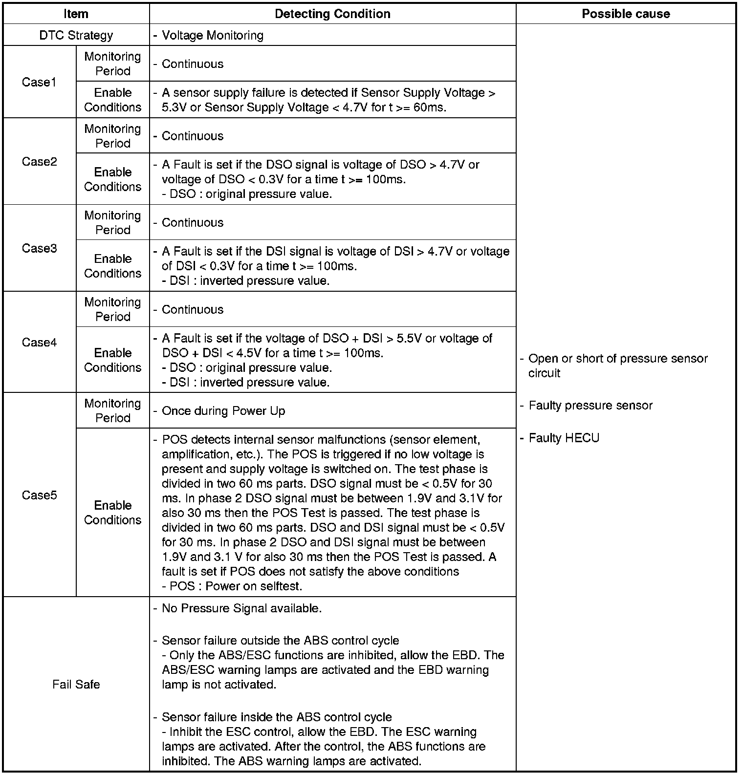 A failure is detected if the output signal value is out of specified range for more than 100ms or pressure sensor self test form is against to specification during self test.