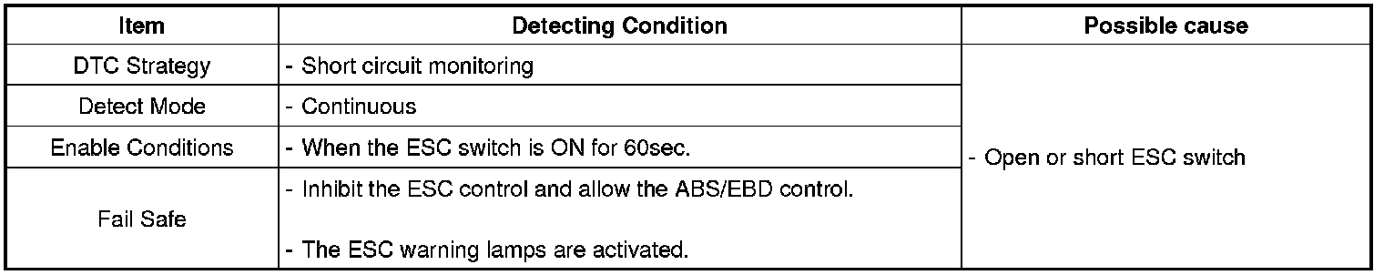 When the ESC switch failure is set there is no signal in the warning lamp and HECU inhibit the ESC control and allow the ABS/EBD control.