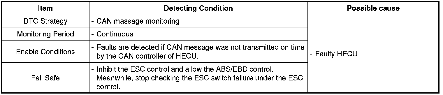The HECU checks the CAN communication lines for normal ESC control, and sets this code if an CAN message is not transmitted within predefined time.