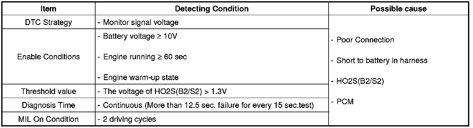 Checking output signals from HO2S under detecting condition, if an output signal is above 1.3 V for more than predeterminate time, PCM sets P0158. MIL (Malfunction Indication Lamp) turns on when the malfunction lasts till consecutive 2 driving cycle.