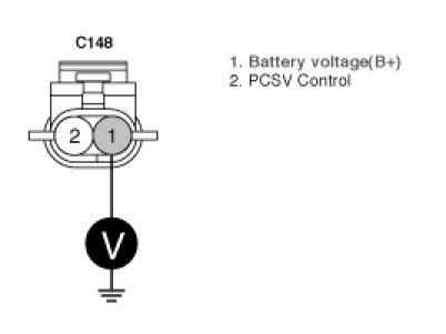 3. Measure voltage between terminal 1 of PCSV harness connector and chassis ground.