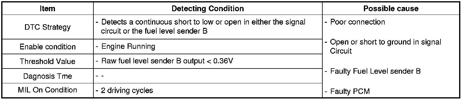 Checking output signals of fuel level sender B under detecting condition, if the fuel level voltage is low than 0.36 V, PCM sets P0462. MIL (Malfunction Indication Lamp) turns on when the malfunction lasts till consecutive 2 driving cycle.