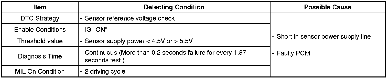 Checking the voltage from sensor power supply every 1.87 sec. under detecting condition, if the value within detecting condition lasts for more than 0.2 sec., PCM sets P0641. MIL (Malfunction Indication Lamp) turns on when the malfunction lasts till consecutive 2 driving cycle.