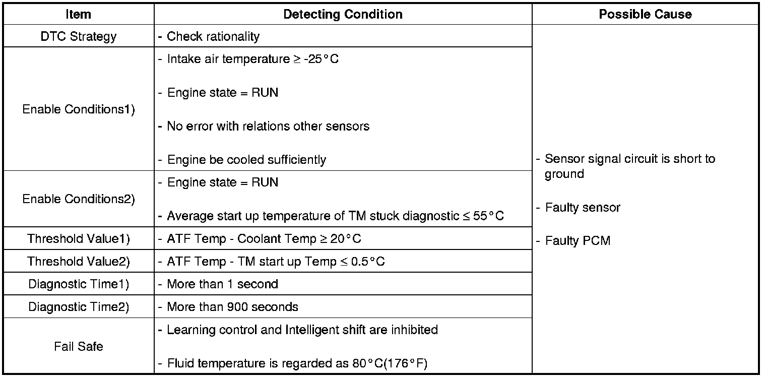 This DTC code is set when the ATF temperature output voltage is lower than a value generated by thermistor resistance, in a normal operating range, for approximately 1 second or longer. The TCM regards the ATF temperature as fixed at a value of 80 °C.
