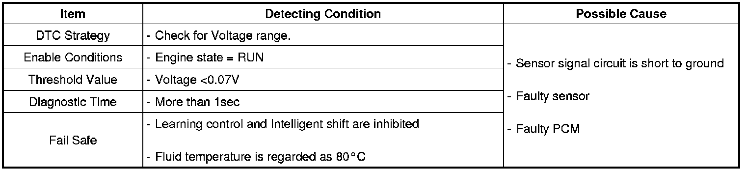 This DTC code is set when the ATF temperature output voltage is lower than a value generated by thermistor resistance, in a normal operating range, for approximately 1 second or longer. The TCM regards the ATF temperature as fixed at a value of 80 °C (176°F).