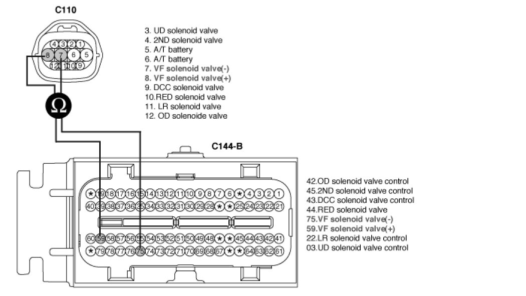 2. Disconnect "A/T SOLENOID VALVE" connector and "PCM/TCM" connector