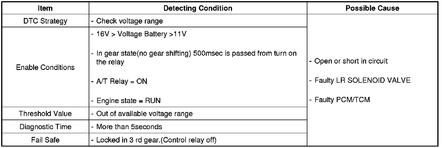 The TCM checks the Low and Reverse Control Signal by monitoring the feedback signal from the solenoid valve drive circuit. If an unexpected signal is monitored (for example, high voltage is detected when low voltage is expected, or low voltage is detected when high voltage is expected), the TCM judges that the Low and Reverse control solenoid circuit is malfunctioning and sets this code.