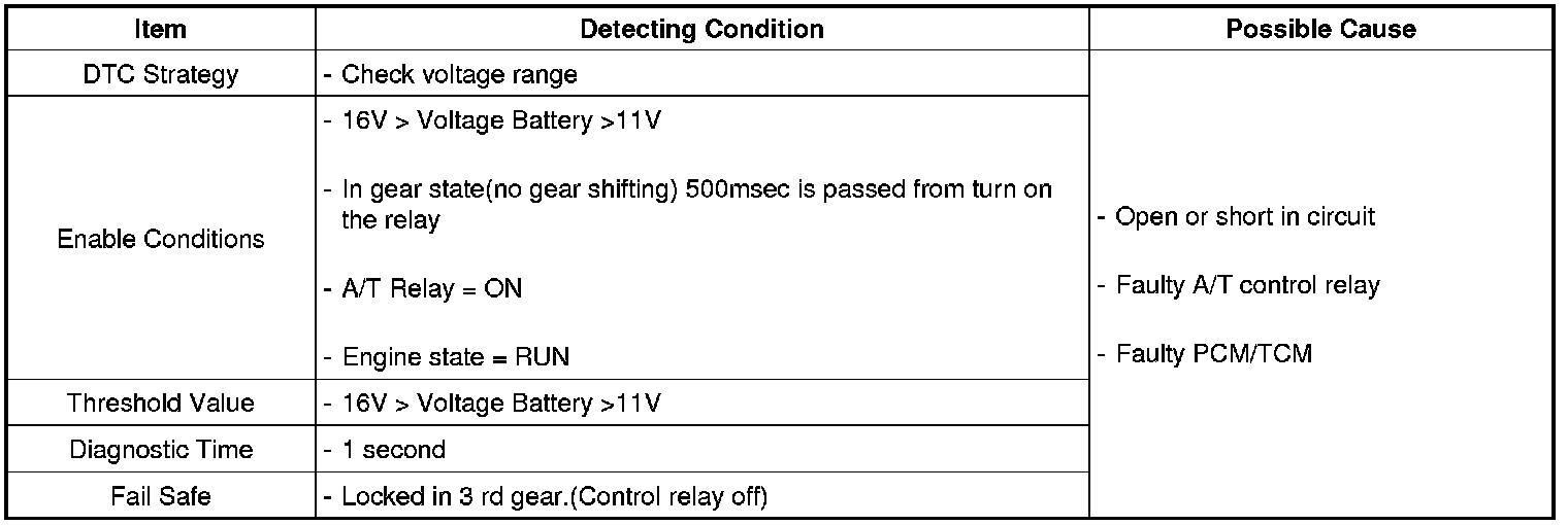 The TCM checks the A/T control relay signal by monitoring the control signal. If, after the igniton key is turned on, an unexpected voltage value, which is quite a bit lower than battery voltage is detected, the TCM sets this code.