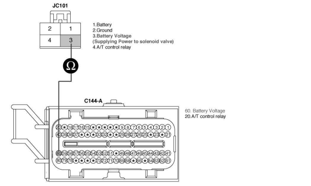 3. Measure the voltage between terminal "1" of the "A/T CONTROL RELAY" harness (JC101) connector and chassis ground.