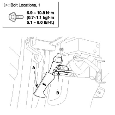 1. Remove the mounting bolt, then remove the hood release handle (A).