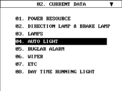 4. Select "Current data" and wiper. Check auto light & wiper value.