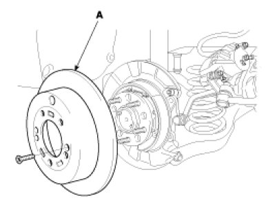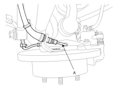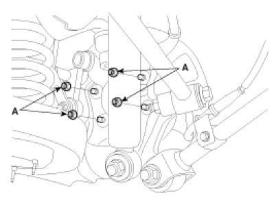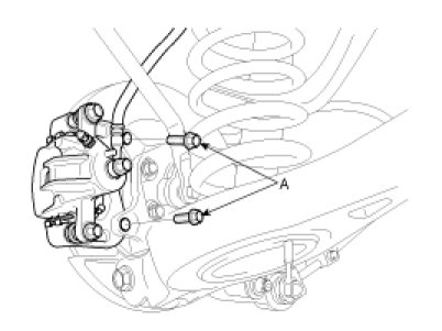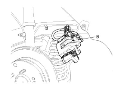 4. After loosening the bolts (A), remove the caliper assembly (B) from the carrier assembly and suspend it with wire.