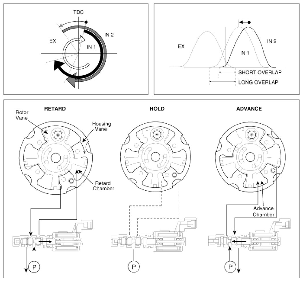 The CVVT changes the phase of the intake camshaft via oil pressure.