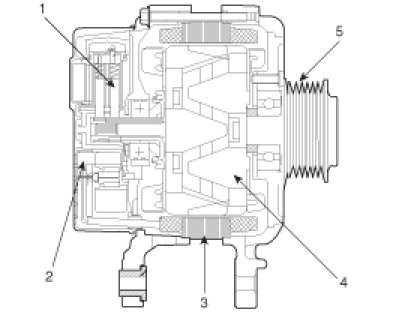 The main components of the alternator are the rotor, stator, rectifier, capacitor brushes, bearings and V-ribbed belt pulley. The brush holder contains a built-in electronic voltage regulator.