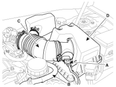 2. Remove air cleaner upper cover (D) and intake hose (C).