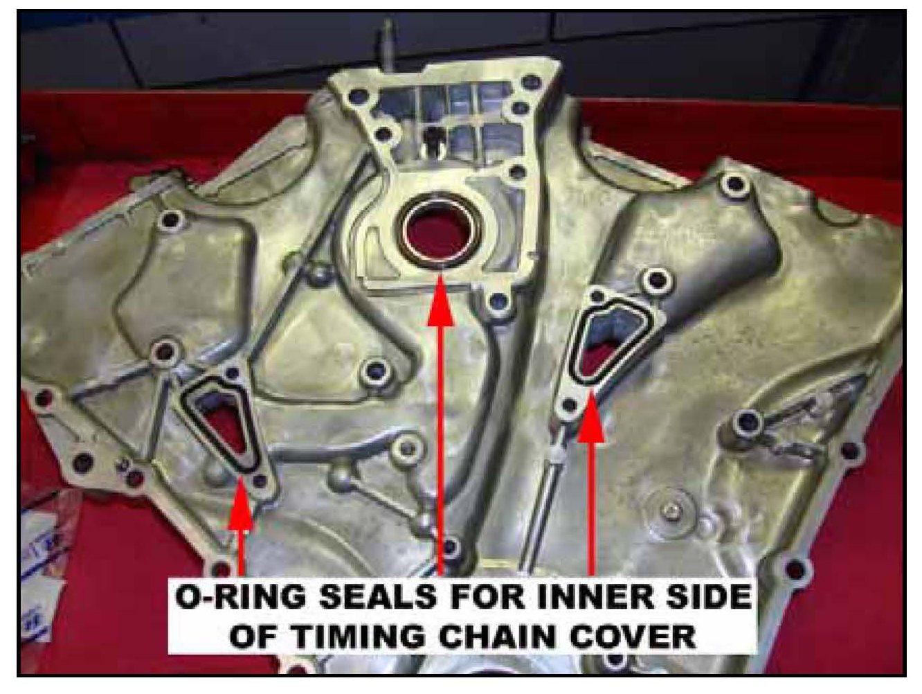 34. Install new rubber o-ring and gaskets to the front and back sealing recesses of the timing chain cover.