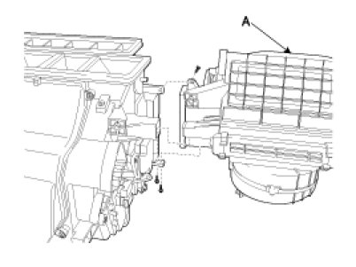6. Remove the blower unit (A) from the heater unit after loosening a mounting bolt and 3 screws.