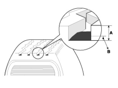 When the tread depth of the tires is less than 1.6 mm (0.063 in), the wear indicators(B) will appear.