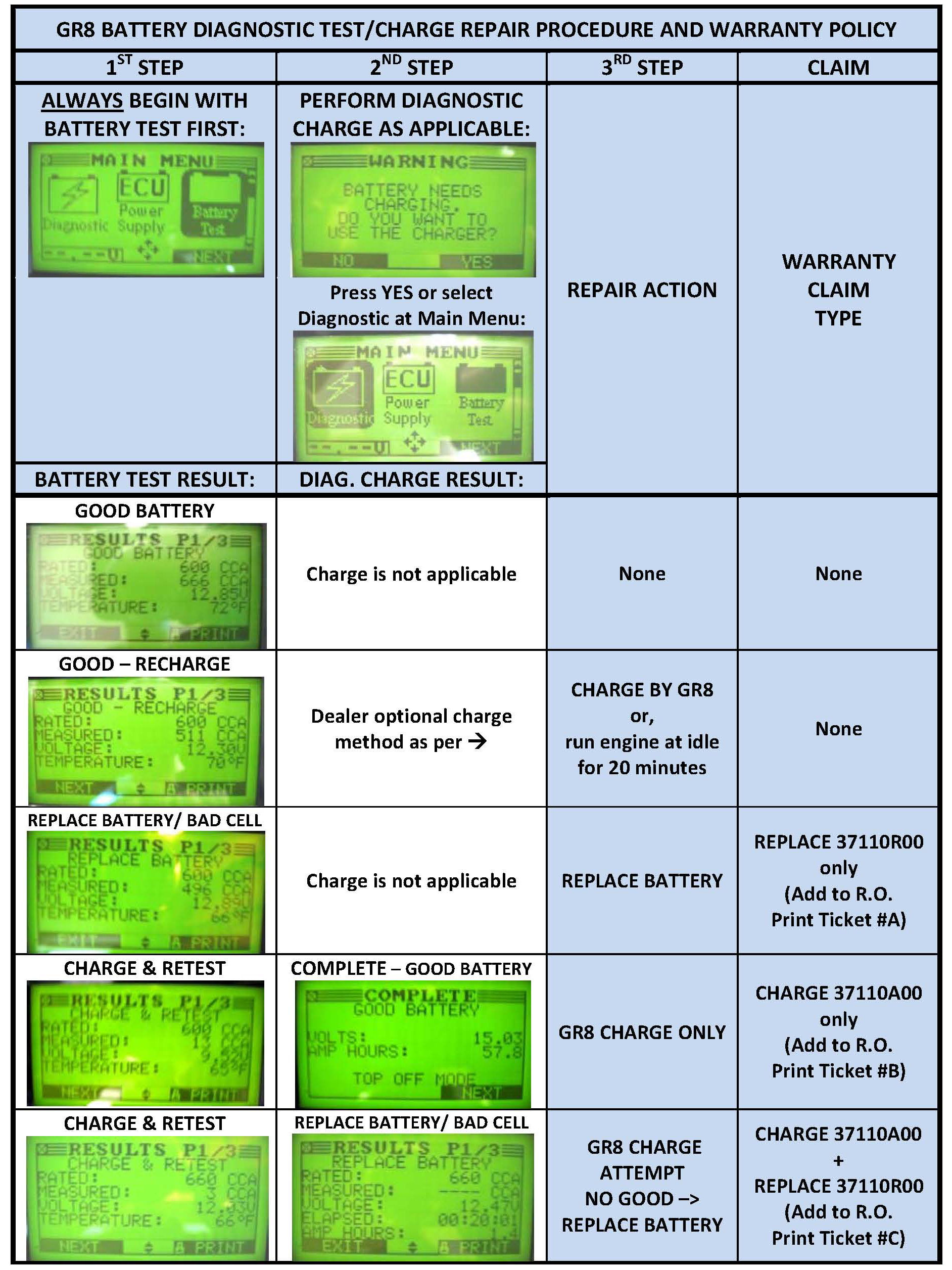 This bulletin describes how to use the GR8 for battery related warranty repair work. The GR8 is a state of the art tool that checks battery health, then performs a reliable intelligent safe charge which can quickly restore some batteries to good condition. For example a dead battery that has not been at a low state of charge for a long period, may be fully revived within 1.5 hours and not make replacement necessary.