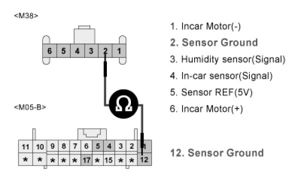 3. Measure resistance between terminal "2" of incar temp.sensor and terminal "12" of A/C Control Unit.