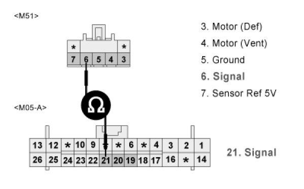 3. Measure resistance between terminal "6" of Direction actuator and terminal "21" of A/C control unit.