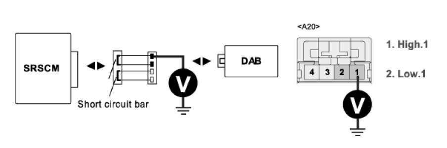 4. Measure voltage between terminal "1 or 2" of the DAB harness connector and chassis ground.